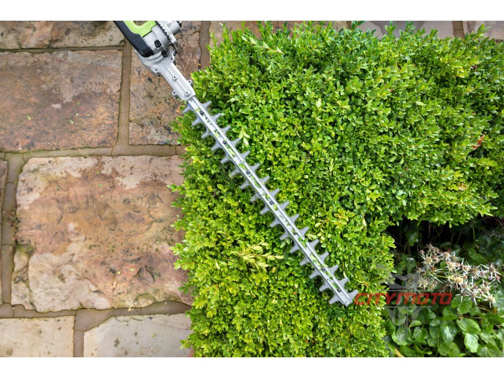 Pro kvalitní úpravu a precizní tvarování živých plotů a okrasných dřevin v okrasných zahradách, zámeckých parcích ale i doma na zahradě je důležitý čistý a přený střih, kterým rostlinu nepoškodíte, nezraníte a rostlina tak po zastřižení zůstává zdravá a svěží. Pro umělecké nebo figurální tvarování porostů je navíc důležitá kompaktnost, lehkost a snadná manipulace. Proto je zde k dispozici krátký nástavec s nůžkami na živý plot s 51cm dlouhou oboustrannou lištou, přesně broušenou pomocí diamantového nástroje. Pohodlné manipululaci při práci přispívá rovněž otočný kloub lišty. Úhel sklonu lišty do 9 různých poloh je velmi důležitý, aby se přizpůsobil příslušné práci na tvarování konkrétního porostu. Mimořádně ostré střižné zuby mají rozteč 26mm jsou schopny ustřihnout dřevinu do průměru až 15 mm. Celková délka nástavce je 120cm. Pohonná jednotka v kombinaci s tímto nástavcem je plnohodnotnými, mimořádně obratnými nůžkami na okrasné porosty a dřeviny.