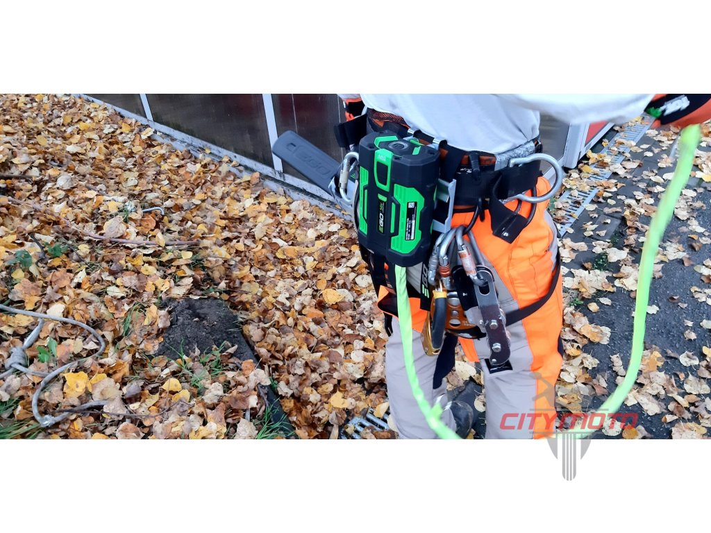 Je všeobecně známo, že čím větší baterie, tím větší výkon, delší pracovní doba, ale bohužel i větší hmotnost baterie. Na druhou stranu zase čím lehčí je stroj, tím komfortnější a snadnější je jeho obsluha. Např. baterie s kapacitou 5,0 Ah váží 2,2kg a např. baterie s dvojnásobnou kapacitou 10,0Ah váží již 3,4kg. To je hmotnost, která při dlouhodobější práci stojí za to převést z rukou na záda. Proto existuje pohodlnější způsob maximálního využití energie bez zbytečného zatěžování rukou. Díky ergonomickému profesionálnímu opaskovému nosiči baterií přemístíme hmotnost baterie na bedra uživatele a stroj se stává podstatně lehčím a ovladatelnějším. Nosič je opatřen kompaktním lože na baterii a závěsem na opasek uživatele. Proti vysunutí nosiče z opasku slouží pojistné řemínky. Pro případ možnosti napájení strojů z kategorie EGO Power+ a EGO Pwer+ Professional je nutné dokoupit adaptér ADB1000.