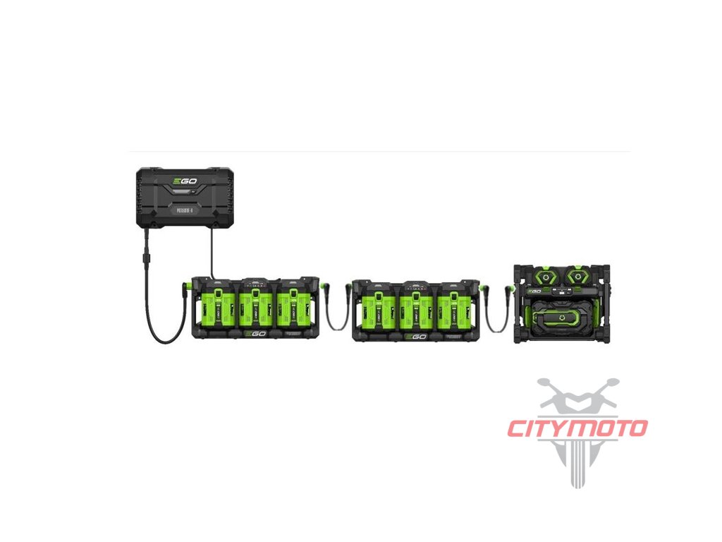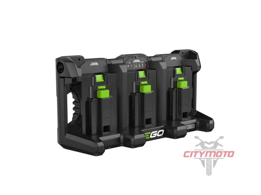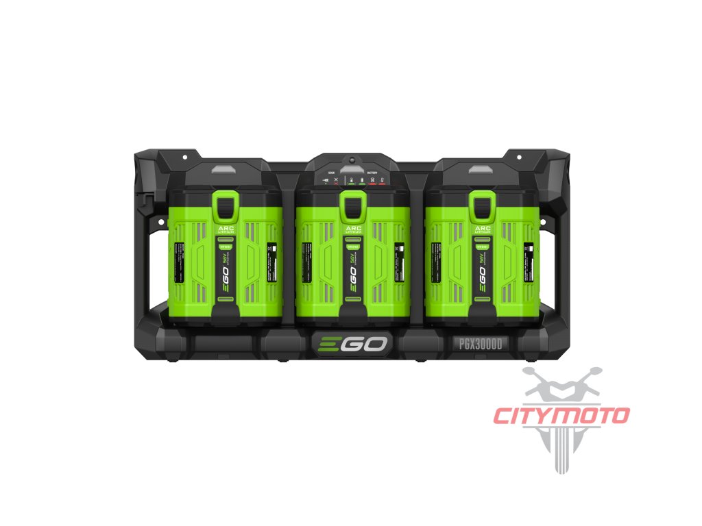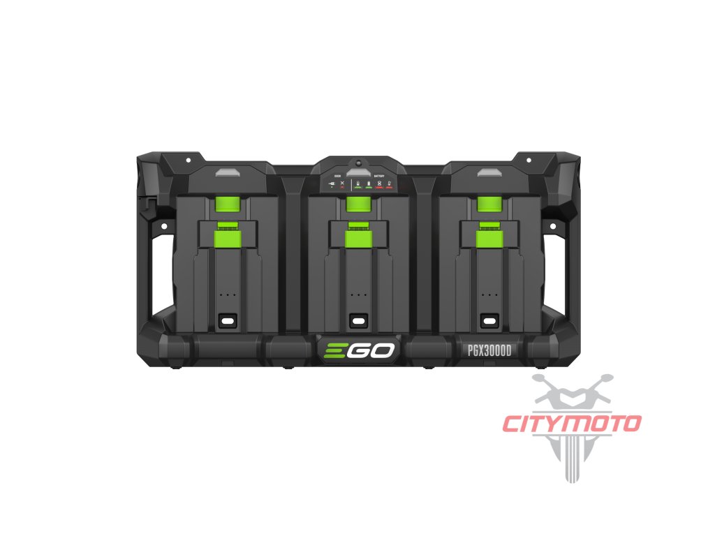 Nabíjecí adaptér PGX300D je k nabíječce připojen nabíjecím kabelem a konektorem se zámkem. 3-místných nabíjecích adaptérů PGX3000D může být připojeno do série za sebou několik a lze tak nabíjet i několik desítek baterií najednou. Nabíječka je opatřena řídící elektronikou, která naprosto samostatně vyhodnotí stav baterií a automaticky zvolí režim nabíjení, dobu nabíjení a nabíjecí proud. Stav baterie a aktuální stav nabití je indikován LED diodami na každé z nich. Takže firma, využívající celou flotilu více strojů EGO, tak např. přes noc nabije současně celý počet baterií, které pokryjí výkon potřebný pro celodenní práci všech strojů.