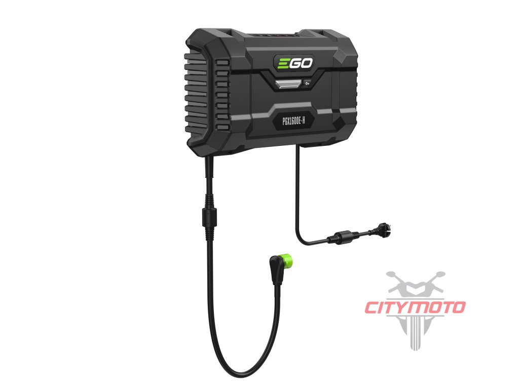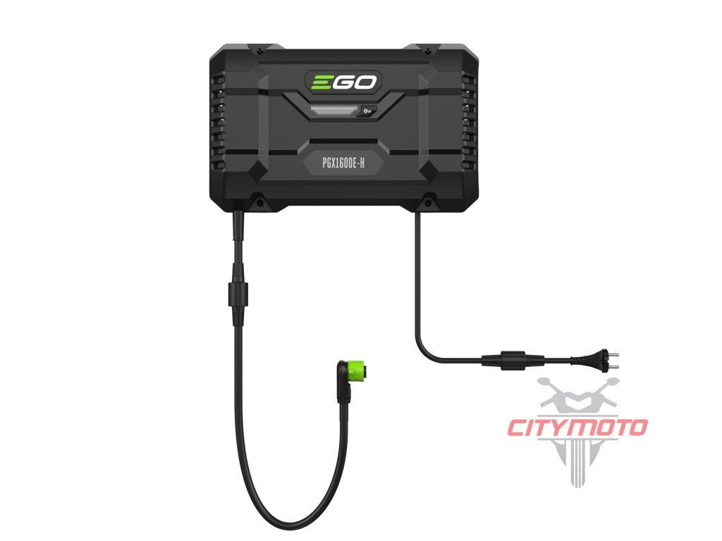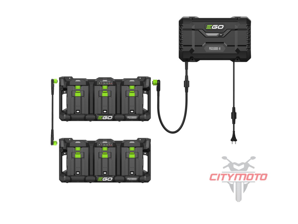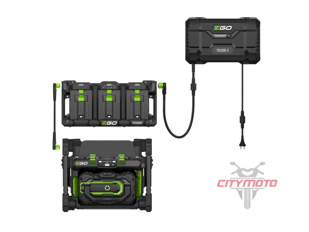 Nabíječka je opatřena nabíjecím kabelem s příslušným konektorem pro připojení nabíjecího adaptéru PGX300D, který je opatřen také nabíjecím kabelem pro připojení druhého, třetího, čtvrtého...adaptéru. Nabíječka je opatřena řídící elektronikou, která naprosto samostatně vyhodnotí stav baterií a automaticky zvolí režim nabíjení, dobu nabíjení a nabíjecí proud. Stav baterie a aktuální stav nabití je indikován LED diodami na panelu. Nabíječka je tak plně automatická bez jakéhokoliv nutného zásahu ze strany uživatele. Takže firma, využívající celou flotilu více strojů EGO, tak např. přes noc nabije současně celý počet baterií, které pokryjí výkon potřebný pro celodenní práci všech strojů. Přes Bluetooth rozhraní je možnost připojení na dálku pomocí EGO Connect aplikace, což umožňuje uživateli nejenom sledovat výkon stroje ale také hlídat aktuální stav baterie tak, aby byla včas připravena k práci.
