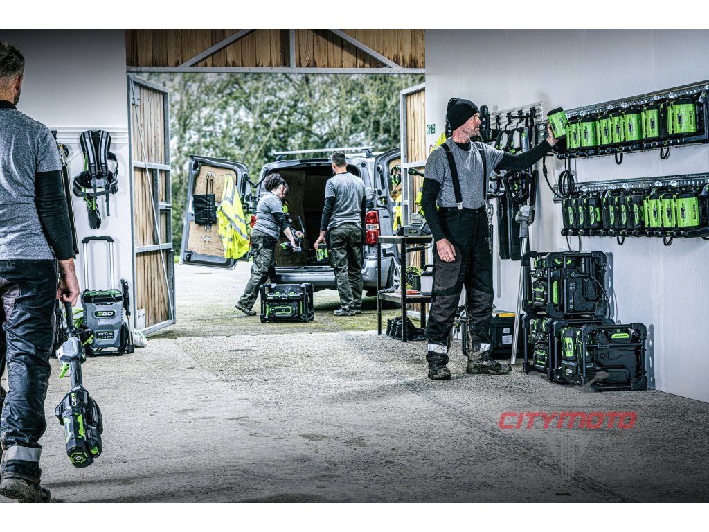 Pro rychlé nabíjení systémových baterií EGO Power+ 56V Arc o celkové kapacitě i více než 250 Ah slouží dílenský, PRO-X nabíjecí systém. Celý systém je stavebnicí, skládající se z nástěnné PRO-X supernabíječky PGX1600E-H a libovolného počtu nástěnných nabíjecích adaptérů, PGX3000D pro 3 baterie EGO každý.