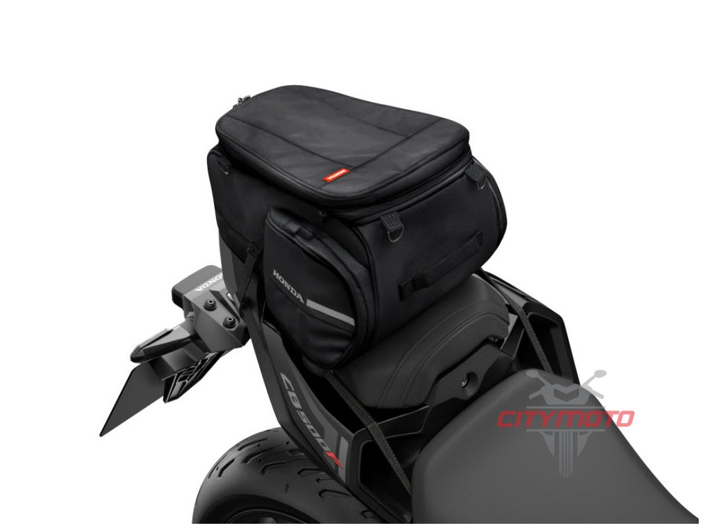 | Malá taška speciálně vyvinutá pro tvar zadních sedel CB. Taška má objem 15-22L a obsahuje nepromokavou krycí plachtu. Rozměry: šířka 355mm, délka 365mm, výška 243mm. Obsahuje tašku i montážní sadu. |