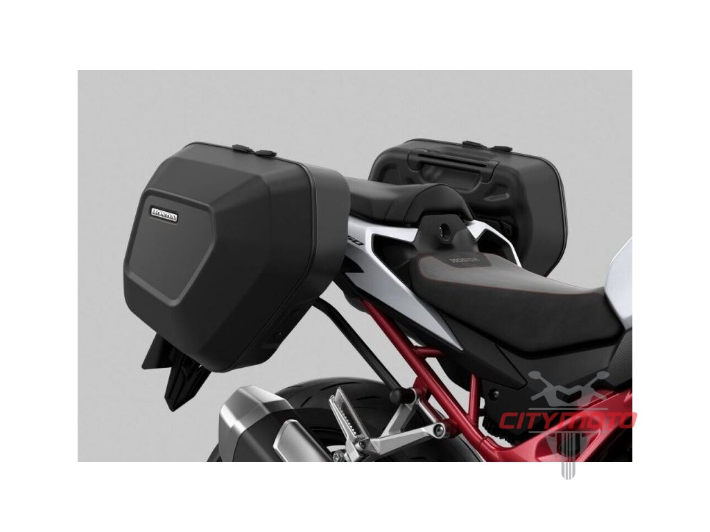 | Sada semirigid (polotuhých) bočních brašen (vyrobených z pryskyřice) speciálně navržených tak, aby vyhovovaly tvaru motocyklu. Včetně vodotěsných vnitřních tašek a zámků. Tašky mají kapacitu 16,5L a rychloupínací uzávěry pro snadné připevnění a odejmutí. Materiál / povrchová úprava: texturovaná pryskyřice a polyester Barva: Černá Maximální nosnost na brašny: 1,4 kg Rozměry: 380 mm x 230 mm x 360 mm (obě) Není v ceně: Montážní sada brašen (08L74-MLB-D00) |