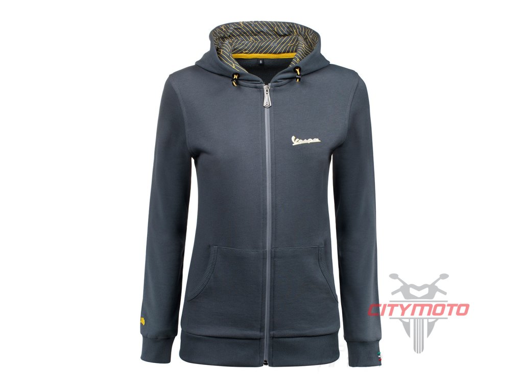 S elegantní mikinou "GRAPHIC" navrhl tým módních návrhářů Vespa naprosto přitažlivý kus ležérního oblečení, který stejnou měrou přináší styl, pohodlí a radost každému jezdci na Vespě. Vesta s kapucí, vyrobená z vysoce kvalitní bavlny, je pro něj i pro ni k dispozici v šedé verzi. Levá část hrudi zdobí reflexní nápis Vespa, pravé zápěstí má natištěný obrys Primavery a levé zápěstí je vyšité barvami italské vlajky, aby byl design ještě působivější. Našitý reflexní prvek na kapuci zajišťuje lepší viditelnost při nošení svetru v nesprávném směru. Kapuce je navíc na vnitřní straně podšitá vzorovanou tkaninou.