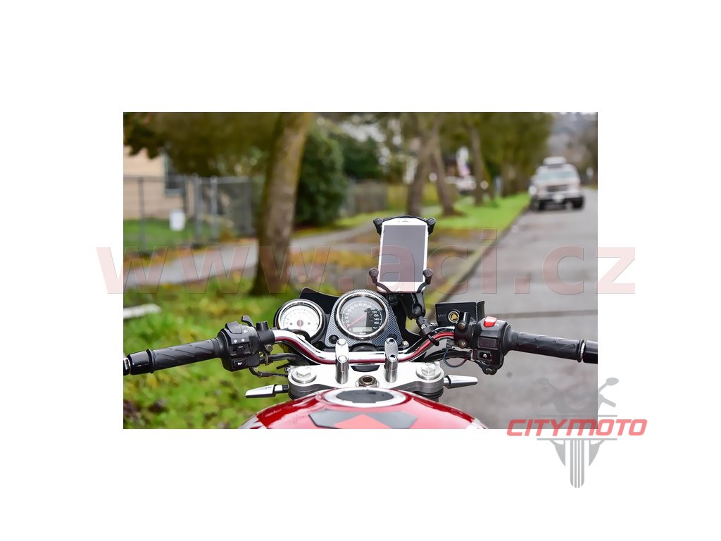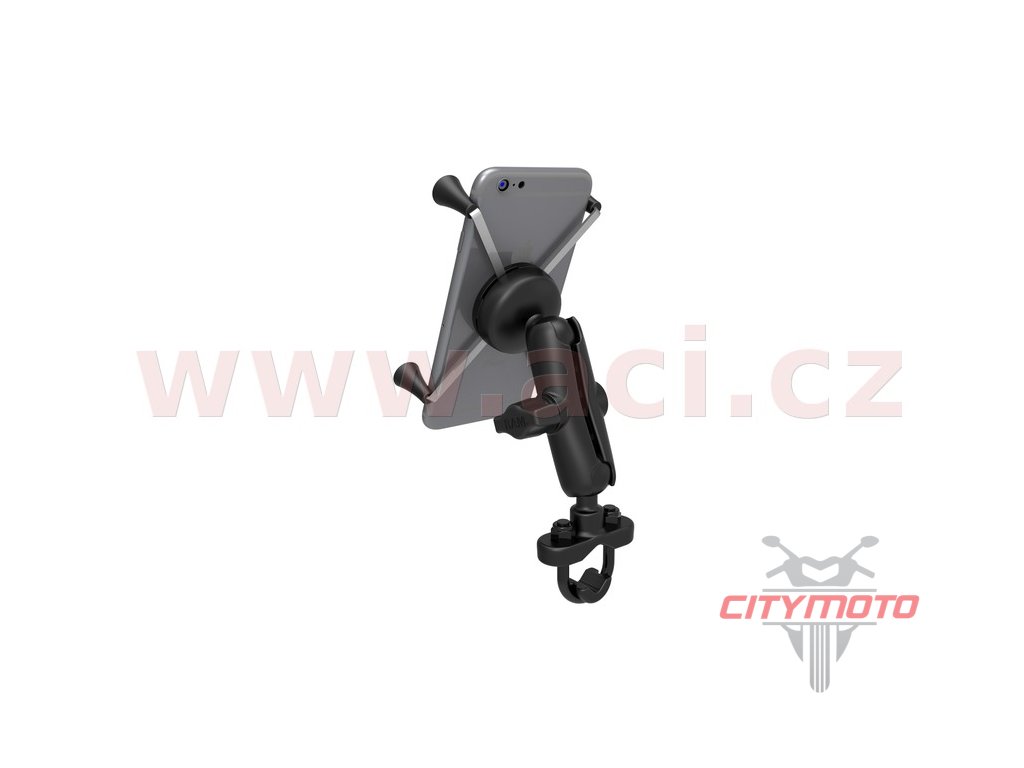 Univerzální držák X-Grip pro větší mobilní zařízení s ramenem o délce 94 mm a s pozinkovanou objímkou na řídítka nebo tyč.