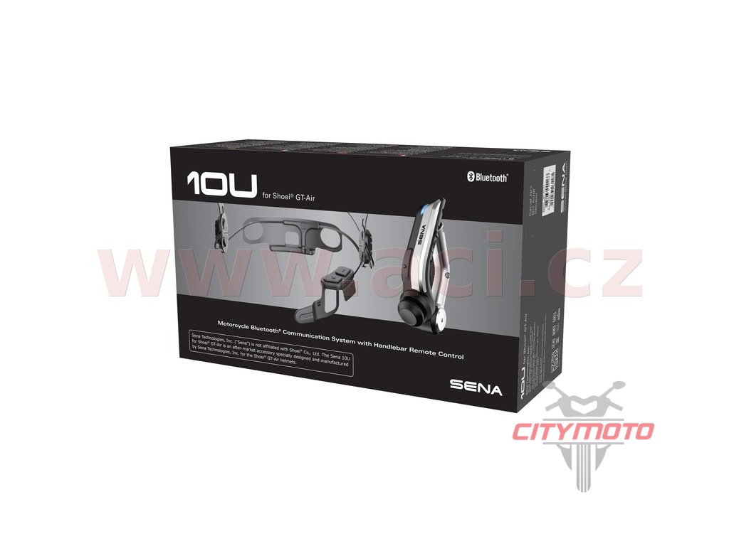 Tento headset je speciálně navržený pro motocykly, a díky Bluetooth technologii s ním můžete: - Komunikovat až se 4 headsety (nejen od stejného výrobce) díky použití Universal Intercom™ protokolu až do vzdálenosti 1600 metrů - Ovládat handsfree mobilní telefon (díky hlasovým příkazům v AJ) - Přijímat pokyny z navigace - Poslouchat oblíbenou hudbu - nejen z Bluetooth mobilního telefonu nebo z jakéhokoliv Bluetooth MP3 přehrávače, ale i z vestavěného FM rádia Headset je určen speciálně k montáži do přilby Shoei GT-Air, jednotlivé komponenty jsou navrženy výhradně dle vnitřní části této konkrétní přilby, vně přilby tedy není headset absolutně vidět. Vždy čistý zvuk díky technologii Advanced Noise Control ™ která v hlasitém prostředí automaticky zesílí zvuk jdoucí ze sluchátek. Po registraci přístup k upgrade firmwaru. Balení obsahuje: - 10U headset (baterie, anténa, reproduktory, pevný mikrofon včetně ovládání headsetu) - Úchyty na reproduktory do přilby - Micro USB datový a dobíjecí kabel - dálkové ovládání na řídítka SENA Handlebar Remote Control Specifikace: Obecné: - Max. doba hovoru: 10 hodin - Teplotní rozpětí: - 10°C až + 55°C - Rozměry a hmotnosti: 77 mm x 68 mm x 58 mm Bluetooth: - Headset Profile (HSP) - Hands-free Profile (HFP) - Advanced Audio Distribution Profile (A2DP) - Audio Video Remote Control Profile (AVRCP) - Bluetooth 4.1 Interkom: pracovní vzdálenost až do 1600 metrů v otevřeném terénu Audio: - Advanced Noice Control™ - Redukce hluku větru FM rádio včetně RDS, frekvence 64 - 108 MHz, paměť na 10 stanic včetně funkce automatického hledání Baterie: - Dobíjecí doba: 3 hodiny - Typ: Lithium polymer Certifikáty: CE, FCC, IC Headsety SENA umožňují komunikaci s headsety ostatních značek díky funkci Universal Intercom Pairing.Doplňkové parametry