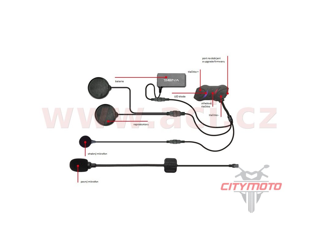 Sada 2 jednotek. Malý velikostí ale nabitý technologiemi. Tento minimalistický headset je speciálně navržený pro motocykly, a díky Bluetooth technologii s ním můžete: - Komunikovat až se 4 headsety (nejen od stejného výrobce) díky použití Universal Intercom™ protokolu až do vzdálenosti 900 metrů - Ovládat handsfree mobilní telefon (díky hlasovým příkazům v AJ) - Přijímat pokyny z navigace - Poslouchat oblíbenou hudbu - jak z Bluetooth mobilního telefonu tak z jakéhokoliv Bluetooth MP3 přehrávače Headset je určen k montáži na přilbu, díky dvěma typům mikrofonů v balení jej lze použít jak na uzavřenou tak na vyklápěcí přilbu: - Pevný mikrofon: pro použití do vyklápěcí přilby - Ohebný mikrofon: pro použití do uzavřené přilby Vždy čistý zvuk díky technologii Advanced Noise Control ™ která v hlasitém prostředí automaticky zesílí zvuk jdoucí ze sluchátek. Po registraci přístup k upgrade firmwaru. Balení obsahuje (vše 2x): - SMH10R headset - Speciální držák na přilbu - Reproduktory do přilby - Pevný mikrofon - Ohebný mikrofon - Micro USB datový a dobíjecí kabel - Ochranné molitanové návleky na mikrofon - Držák pevného mikrofonu - Baterie - Držák baterie - Micro USB nabíječka do 12V zásuvky motocyklu - Imbusový klíč - Potřebné upevňovací pásky pro držáky, reproduktory a mikrofony Specifikace: Obecné: - Stand-by doba: 7 dní - Max. doba použití: 10 hodin - Teplotní rozpětí: - 10°C až + 55°C - Rozměry a hmotnosti: 71 mm x 37 mm x 14 mm, 21 g Bluetooth: - Headset Profile (HSP) - Hands-free Profile (HFP) - Advanced Audio Distribution Profile (A2DP) - Audio Video Remote Control Profile (AVRCP) - Bluetooth 3.0 Interkom: pracovní vzdálenost až do 900 metrů v otevřeném terénu Audio: - Advanced Noice Control™ - Redukce hluku větru Baterie: - Dobíjecí doba: 2,5 hodiny - Typ: Lithium polymer Certifikáty: CE, FCC, IC Headsety SENA umožňují komunikaci s headsety ostatních značek díky funkci Universal Intercom Pairing.