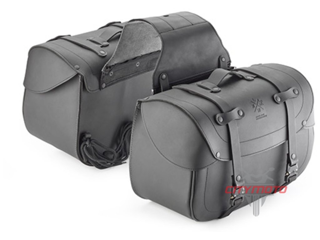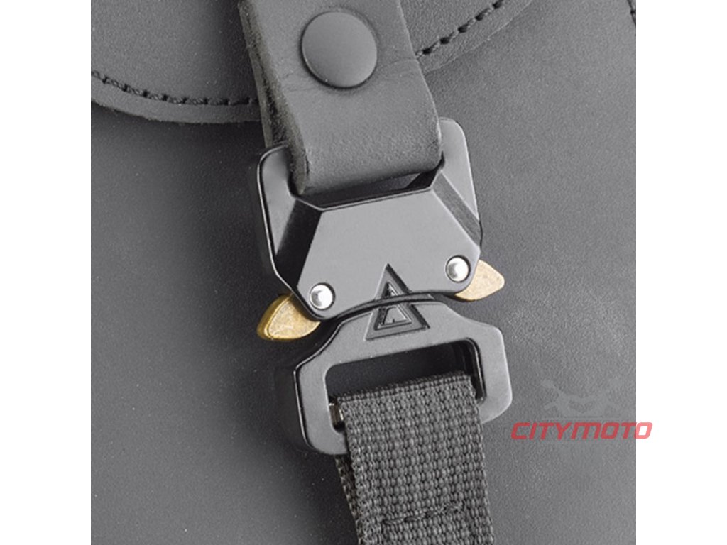 Boční kožené brašny Café Racer KAPPA ze 100% bůvolí kůže, objem 28 L. Uchycení přes centrální popruh přes sedlo spolujezdce nebo zadní blatník. Brašny jsou k popruhu připevněny zipem. Tři patentky na každé brašně zabrání nechtěnému rozepnutí zipu.