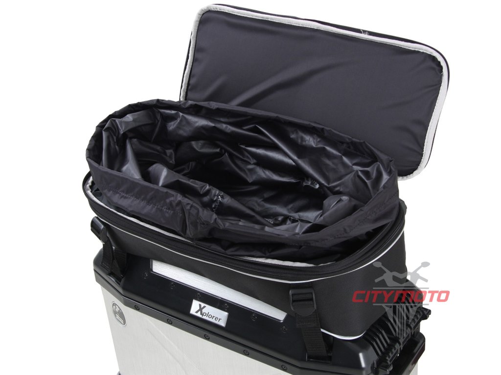 Horní kapsa s prodlužovacím zipem je připevněna k víku Xplorer pomocí 4 popruhů. Očka pro popruhy jsou již integrována ve víku. Taška má voděodolnou vnitřní tašku.