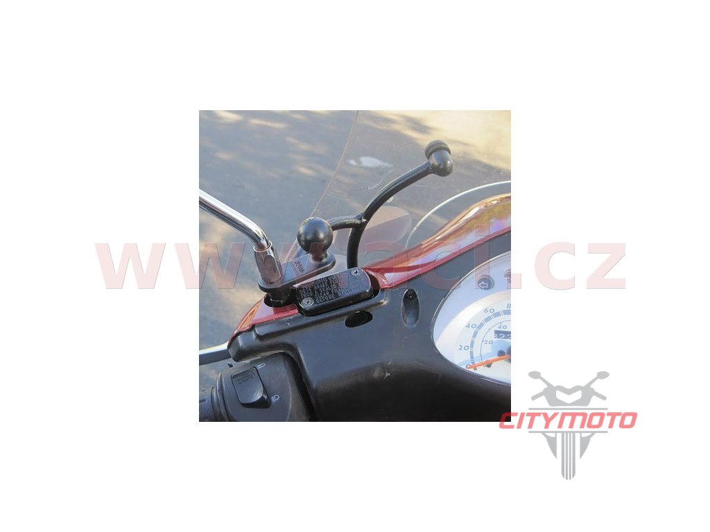 Úchyt na motorku nebo skútr na zpětné zrcátko nebo pod svíracím šroubem řídítek s průměrem šroubu do 11mm. Úchyt se připevňuje mezi nohu zrcátka a řídítka. Úchyt má rozměr 57x 22mm. Patentovaný kulový čep je vyroben z velmi kvalitní pryže tak, aby tlumil nárazy a vibrace, které by jinak byly přenášeny na upevněné elektronické zařízení.