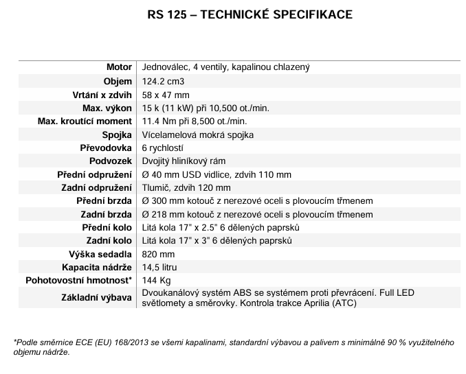 Aprilia RS 125 GP Replica spojuje technickou vyspělost s autentickým sportovním charakterem. V těle bije jednoválcový čtyřtaktní motor se čtyřmi ventily, kapalinovým chlazením a homologací Euro 5+, který při každém přidání plynu nabízí opravdový zážitek z jízdy. Rychlořazení Quick Shift je již v základní výbavě a umožňuje extrémně rychlé řazení, zatímco trakční kontrola (s možností deaktivace) a dvoukanálový ABS Bosch s protiblokovací funkcí zajišťují maximální kontrolu a bezpečnost.