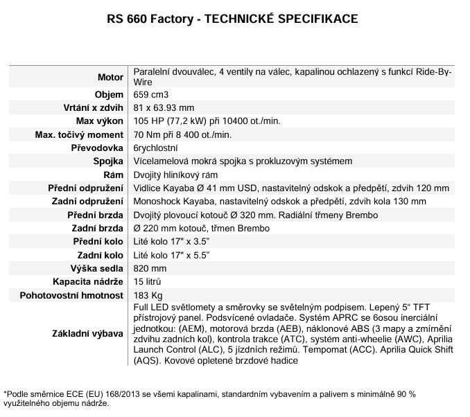 Soutěžní duch modelu Aprilia RS 660 Factory se odráží v kontrastních barvách dvoubarevného sedla a Factory polepů. Při jízdě na silnici dominuje agresivní černá barva, která se táhne i po bocích motocyklu. Když se však stroj nakloní opravdu ostře, vystupuje do popředí červená barva viditelná shora, která odhaluje logo Aprilia vyražené na velkém předním přítlačném křídle. Dynamicky tvarovanou kapotáž s moderními liniemi doplňuje aerodynamika inspirovaná MotoGP, včetně křidélek, která zlepšují stabilitu ve vysokých rychlostech. Každý detail byl navržen tak, aby dokonale spojoval styl a funkci a ztělesňoval pravou podstatu závodní DNA.