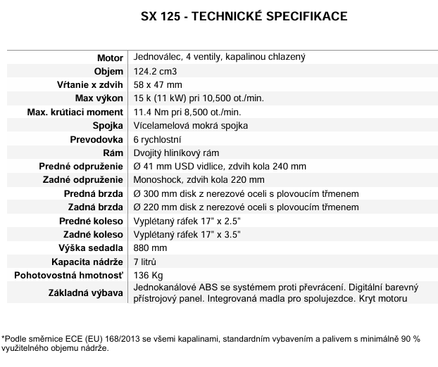Lehká a přesně ovladatelná SX 125 je poháněna moderním čtyřventilovým jednoválcovým motorem homologovaným podle normy Euro 5+, který nabízí vynikající točivý moment a výkon v celém rozsahu otáček. Přesnost a jistotu v zatáčkách zajišťuje odpružení s vysokým zdvihem a systém Bosch ABS s funkcí anti-rollover, který při brzdění reguluje zdvih zadního kola zásahem do přední brzdy. Brzdový systém se skládá ze dvou plovoucích třmenů: přední s dvoupístkovým třmenem se zakousne až do 300mm kotouče, zatímco zadní pracuje s 220mm kotoučem.
