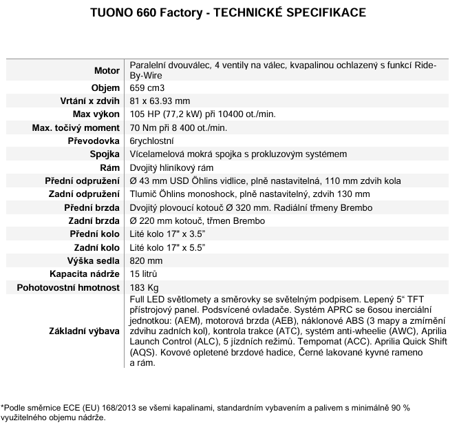Tuono 660 Factory je vybaveno dvouválcovým motorem splňujícím normu Euro 5+, který dosahuje výkonu až 105 k při 10 400 ot/min a maximálního točivého momentu 70 Nm při 8 400 ot/min. Tento dynamický a výbušný výkon zůstává za všech okolností plynulý a pod kontrolou - díky brzdovému systému Brembo a pokročilému odpružení Öhlins. Přední část tvoří vidlice NIX 30 o průměru 43 mm, zatímco vzadu je tlumič STX 46 s integrovanou nádržkou. Obě jednotky jsou plně nastavitelné - odskok, komprese a předpětí pružiny. Jakmile se posadíš do sedla, neexistují žádné výmluvy - jen čistý výkon, který tě vybízí k tomu, abys využil každou silnici a každou zatáčku.