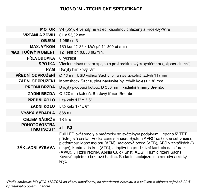 Srdcem modelu Tuono je motor V4 o objemu 1099 cm3, který je vrcholem technologie motorů Aprilia. Jedinečný z hlediska výkonu a syrového zvuku je navržen tak, aby poskytoval explozivní výkon, který zůstává plně kontrolovatelný díky plynulé odezvě na plyn. Motor splňuje normu Euro 5+, dosahuje výkonu až 180 k a maximálního točivého momentu 121 Nm s působivým a vzrušujícím výkonovým pásmem v celém rozsahu otáček, takže je ideální i pro dynamickou jízdu na silnici.