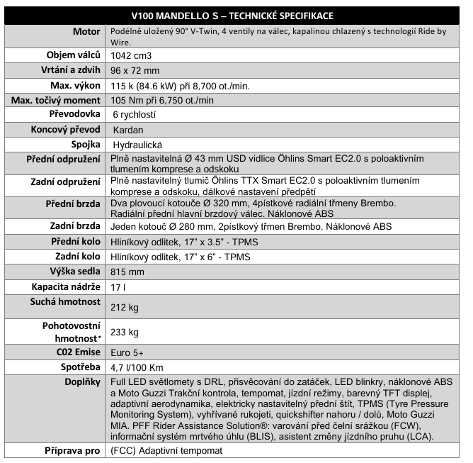 Standardní výbava modelu V100 Mandello S zahrnuje systém konektivity Moto Guzzi MIA: technologii, která umožňuje připojení chytrého telefonu k palubní elektronice prostřednictvím Bluetooth. Tímto způsobem je možné získat souhrnné statistiky o každé jízdě a spravovat hovory, zprávy a seznamy skladeb, aniž byste museli sundat ruce z řídítek.