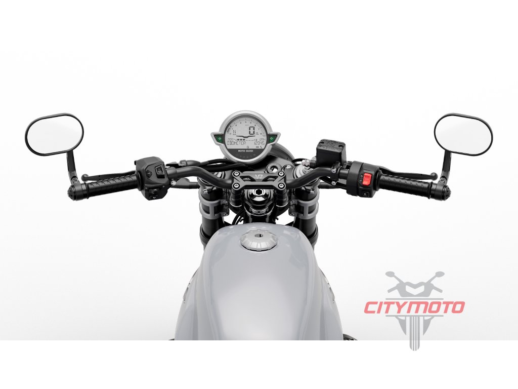 Mezi význačné prvky Moto Guzzi V7 Sport patří přední brzda se dvěma kotouči, obrácená vidlice, IMU s naklápěcím ABS a vlastní jízdní režim Sport.