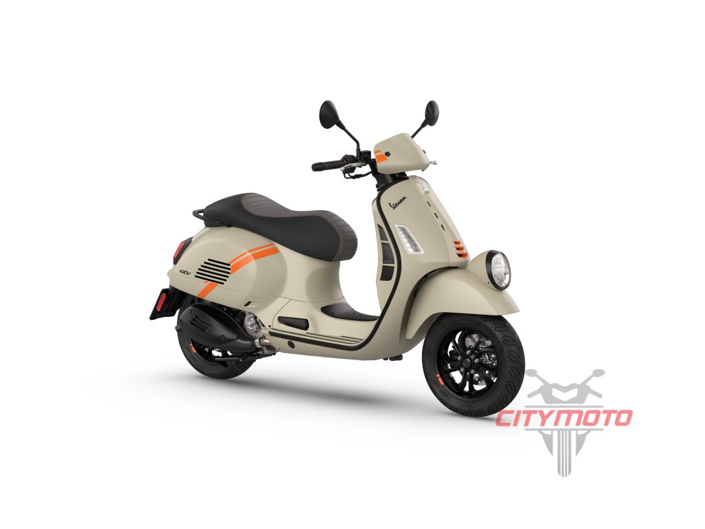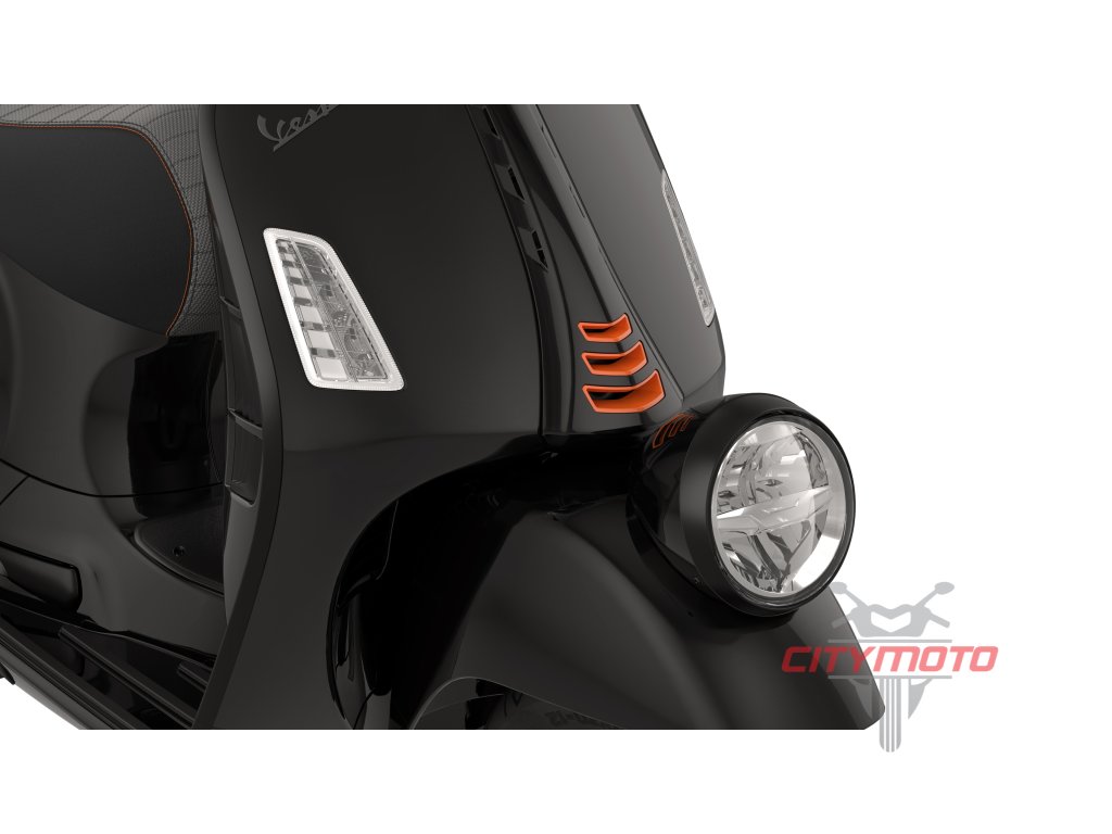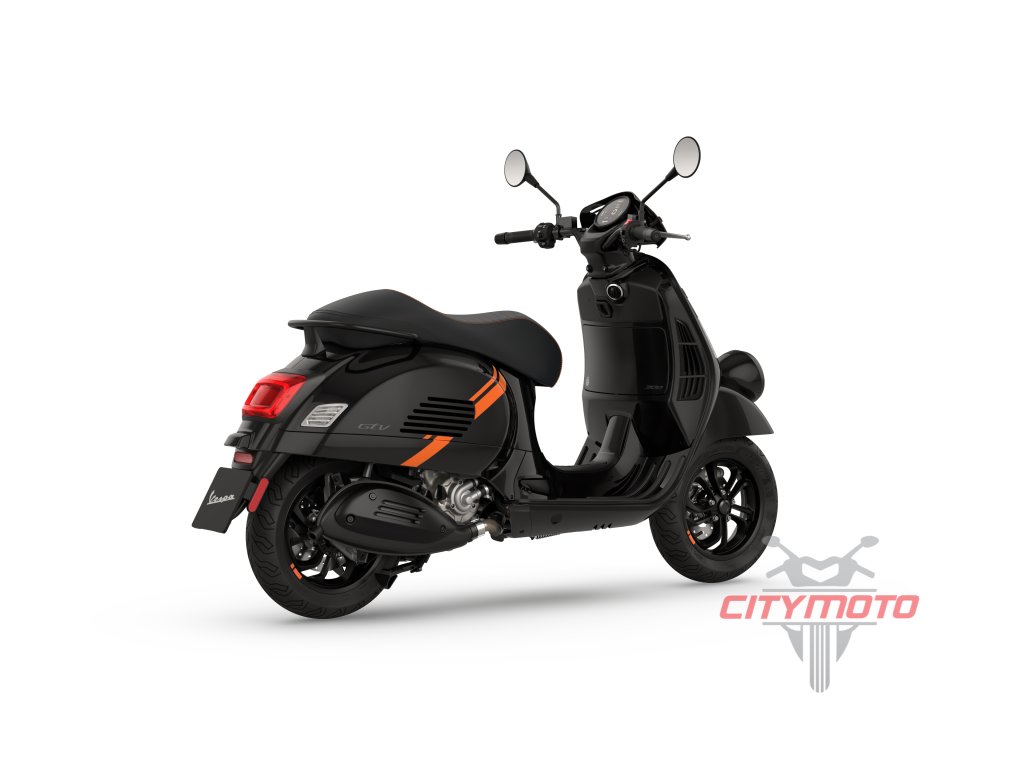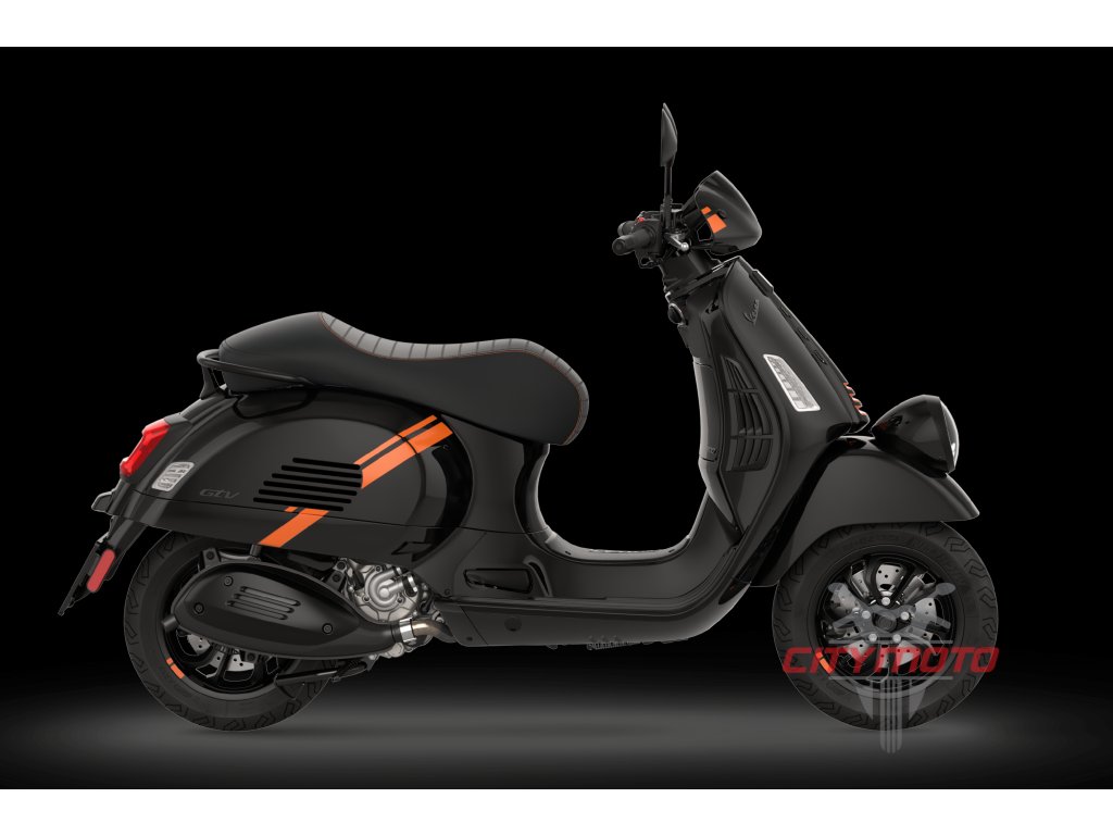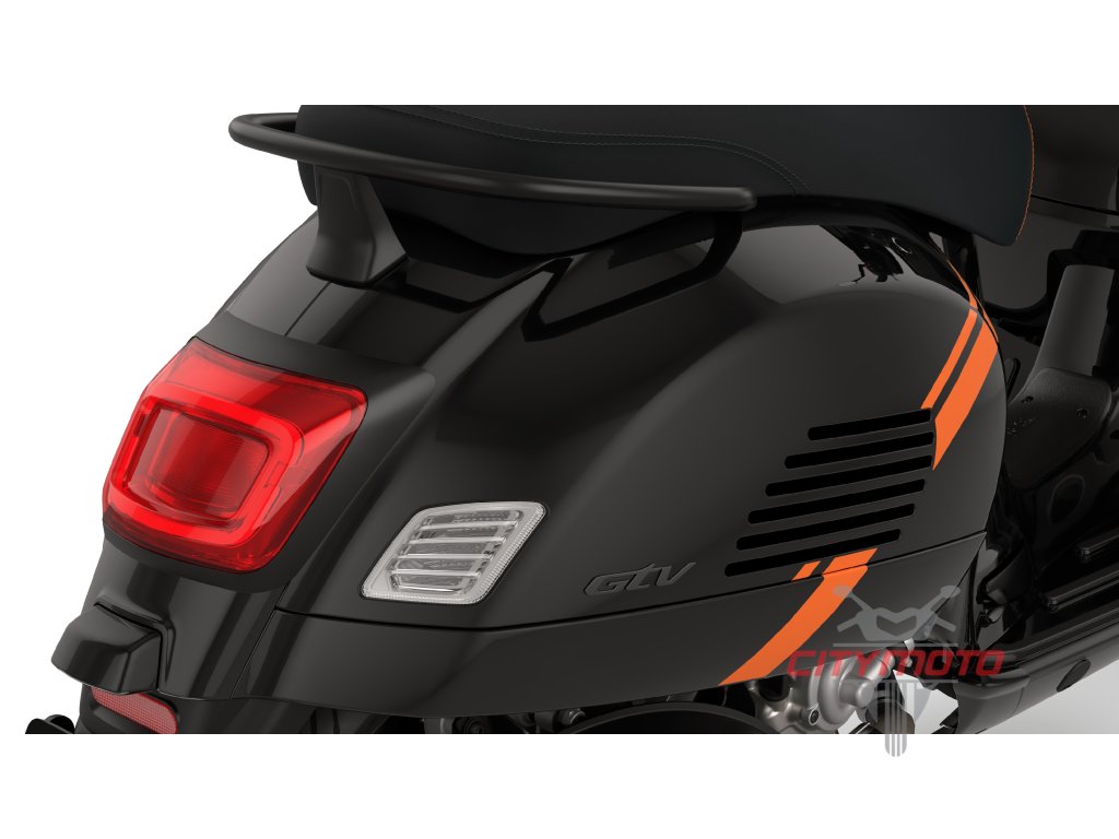 Nejnovější model převzal všechny ikonické prvky modelu GTV. Jsou tu charakteristická odhalená řídítka, a samozřejmě také světlo umístěné na předním blatníku. K tomu nové GTV přidává elegantní high-tech prvky, které podtrhují její inovativní charakter. Jednomístné sedlo, speciální kapotáž a matně černé detaily jsou jen některé z prvků, které dodávají Vespě GTV odvážnou, sportovní osobnost. Pětipaprsková matně černá kola a kontrastní oranžová grafika na bocích jsou také poklonou závodnímu světu.