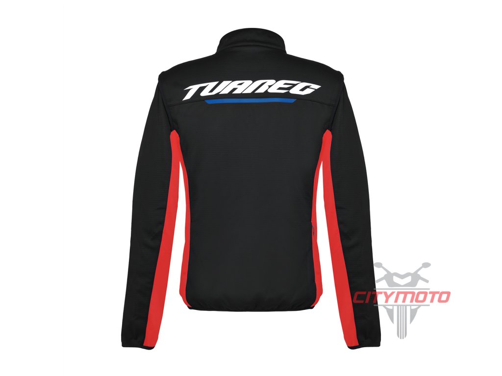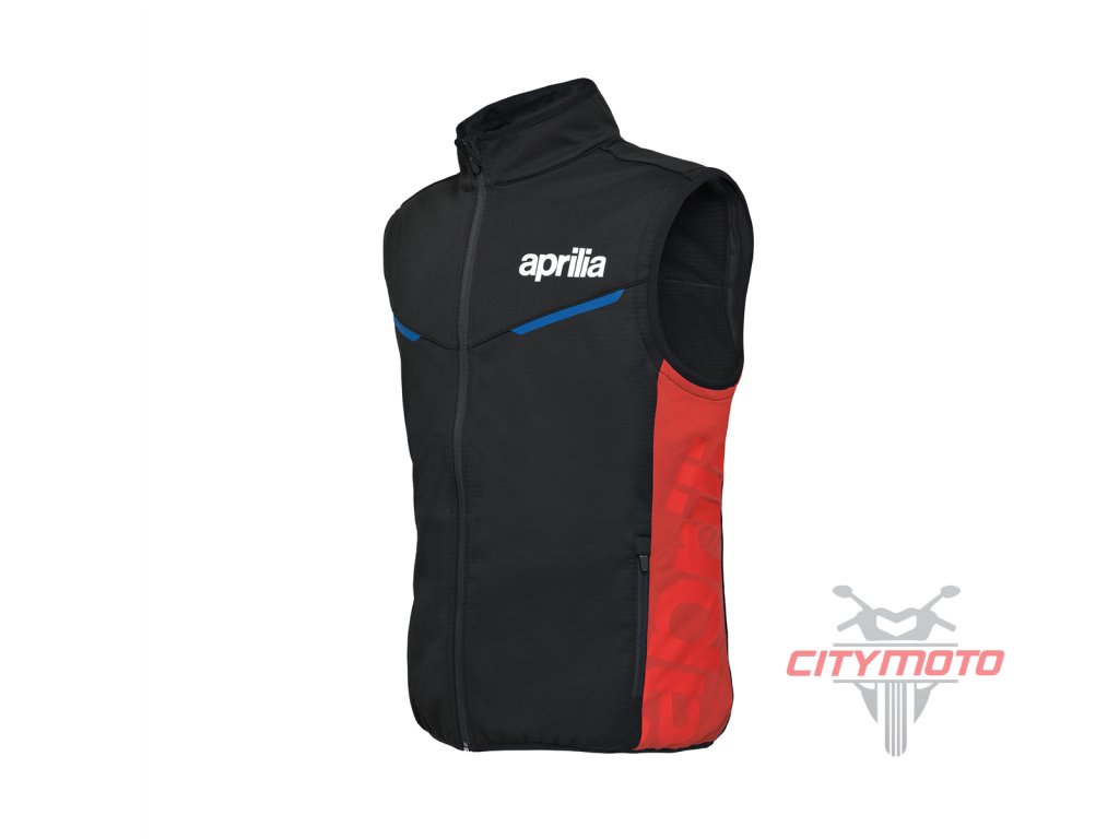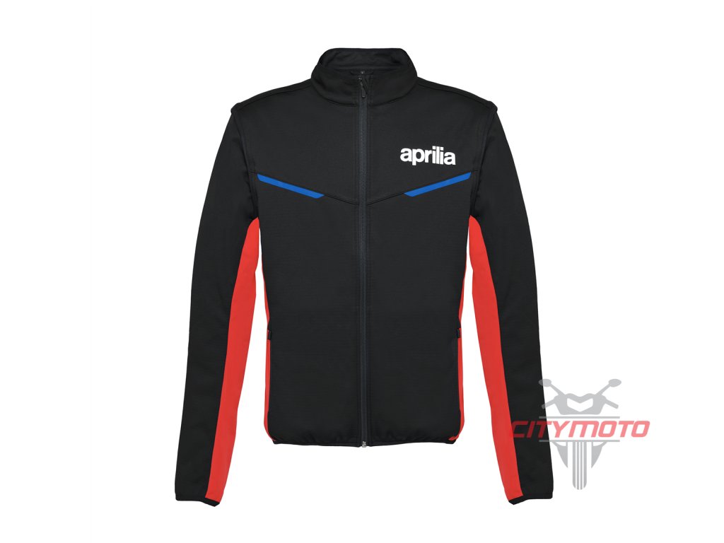 Softshellová bunda s odnímatelnými rukávy. Oděv je navržen pro nošení s chrániči i bez nich (i s těmi nejobjemnějšími). Strečová látka na obou stranách a na vnitřní straně rukávů. Refrakční logo Aprilia a aplikace vpředu, na rukávu a vzadu. 2 přední kapsy a 1 zadní kapsa na zip. Polyester 96%, Elastan 4%.