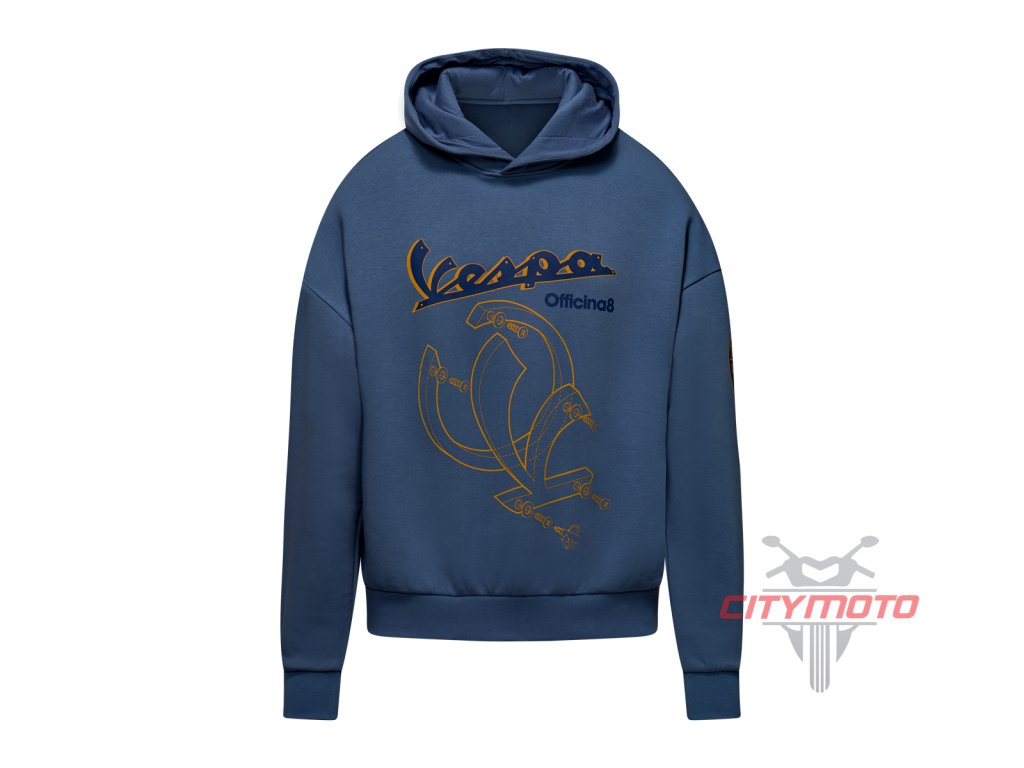 Pohodlná a teplá mikina s kapucí vyrobená z měkké, česané bavlny. S logem Vespa Officina 8 a novou grafikou na přední straně a rukávu, stejně jako exkluzivním tištěným štítkem na vnitřní straně.