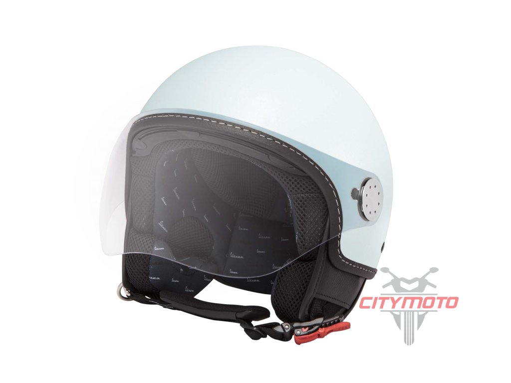 Na zadní straně skořepiny přilby je barevně sladěné vyryté logo Vespa – jemný, ale stylový detail. Mikrometrický uzavírací systém s integrovaným kroužkem proti krádeži nabízí bezpečné držení a vysoký komfort nošení.