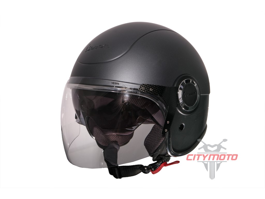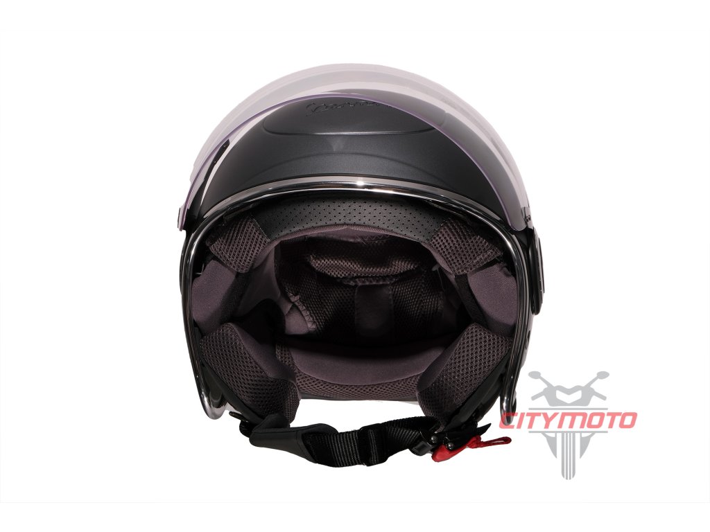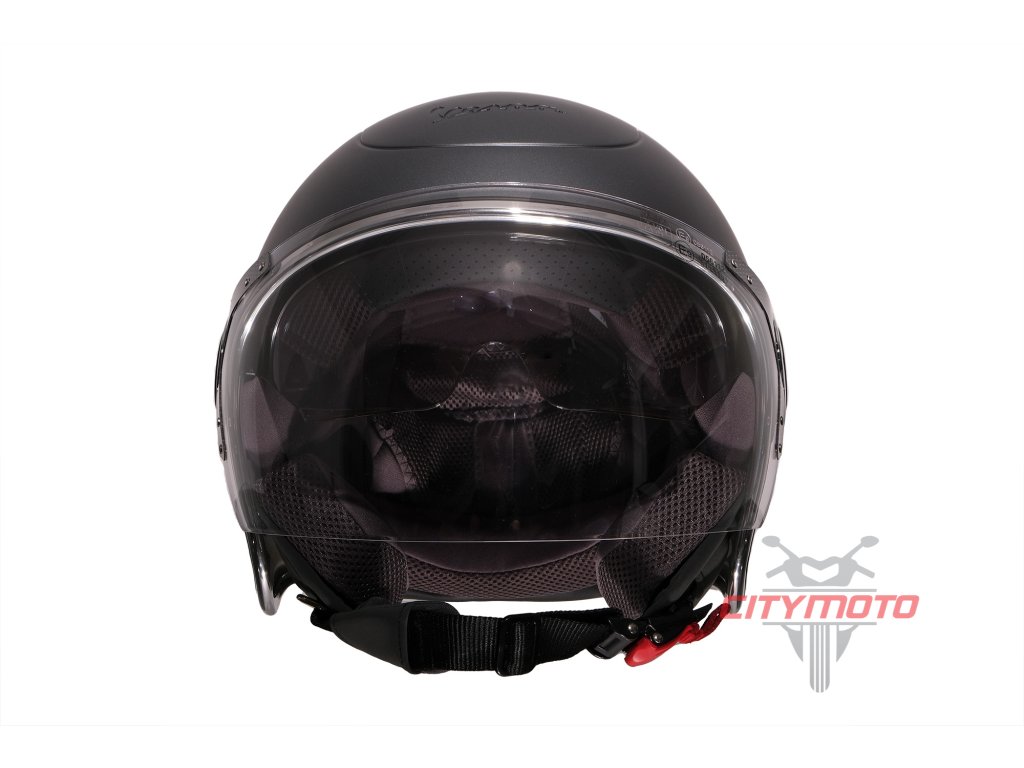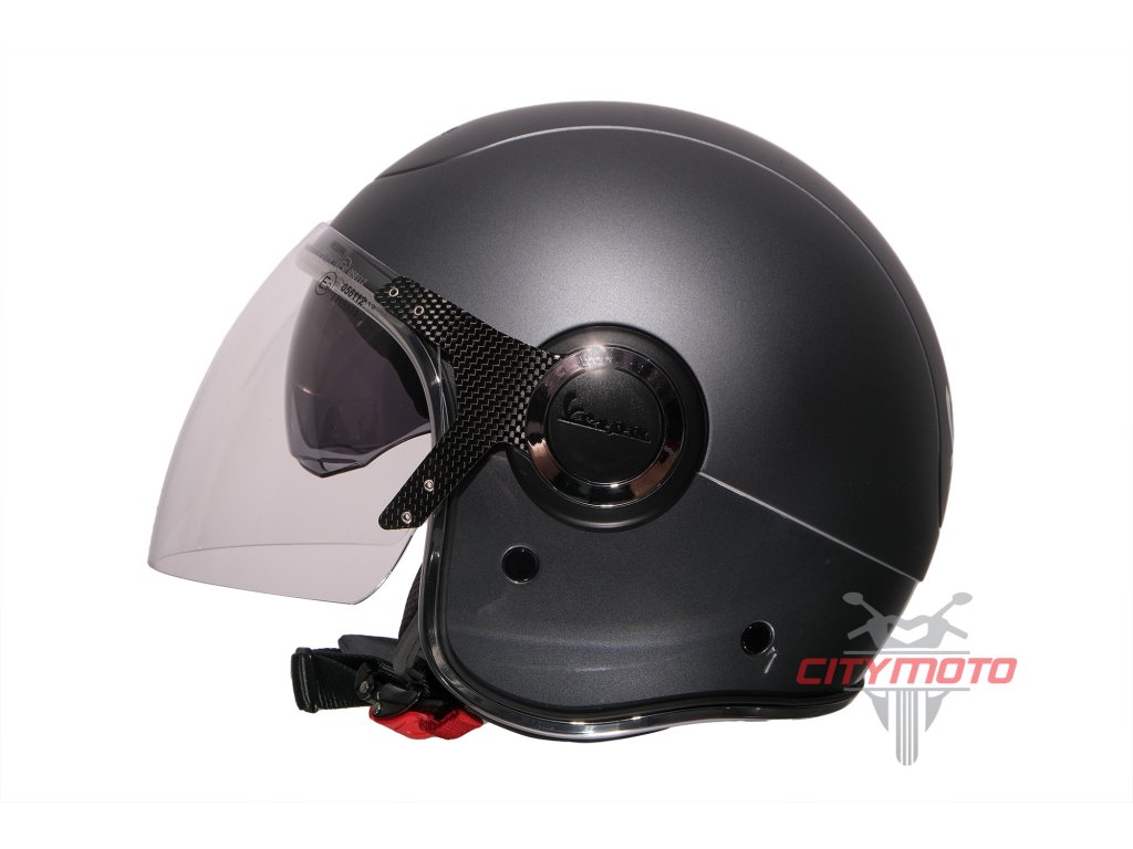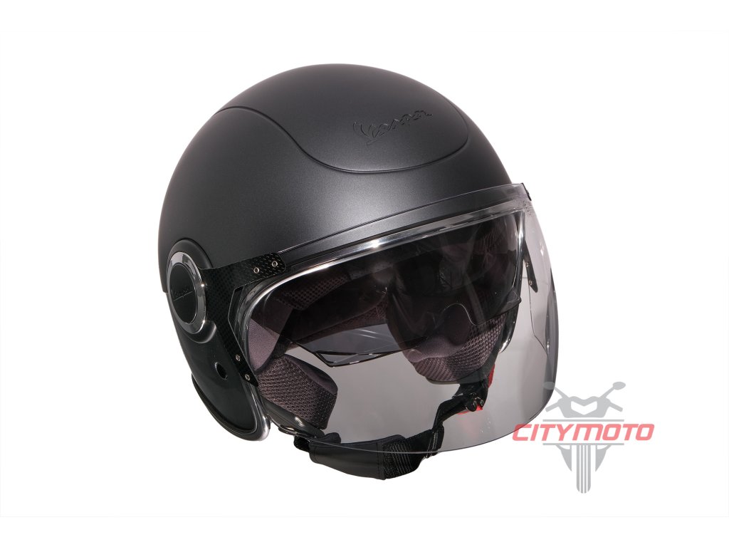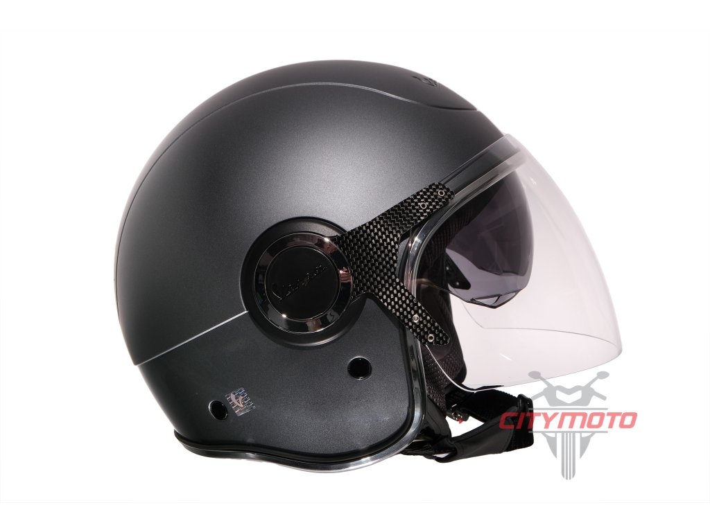 ABS helma. Exkluzivní model pro Vespu, nový a moderní design. Vysoce kvalitní detaily a povrchové úpravy, dlouhý čirý kšilt a krátká vnitřní sluneční clona, popruhy s ráčnovým uzávěrem, vnitřní podšívka vyjímatelná, prodyšná a omyvatelná.