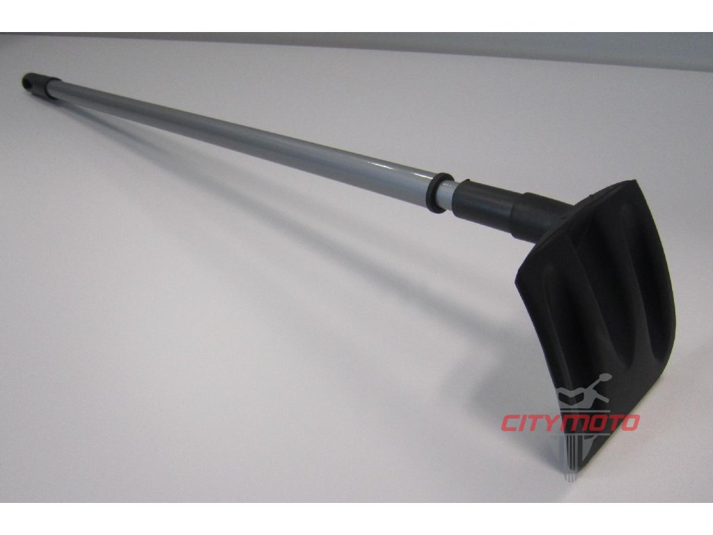 Komín výhozu trávy do sběrného boxu se musí pravidelně kontrolovat a čistit. Tuto činnost vám usnadní teleskopická, výsuvná čistící škrabka. Rovněž v případě, že dojde k zahlcení sekacího zařízení a následnému ucpání komínu výhozu trávy do sběrného boxu, je nutné komín výhozu vyčistit a napěchovanou trávu z komínu výhozu uvolnit. K tomu slouží čistící teleskopická škrabka, kterou lze na traktor upevnit do uchytů, umístěných na horním, plastovém víku sběrného boxu. Po vyčištění komínu výhozu škrabku opět složíme a upevníme do záchytů, připravenou k dalšímu případnému použití.