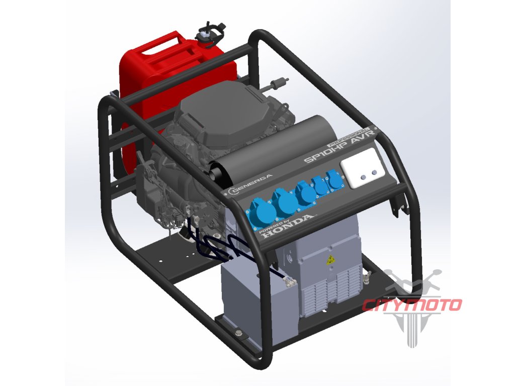 Elektrocentrála SP 10 HP AVR: model velké, jednofázové elektrocentrály s regulací výstupu pomocí AVR. Výkonný alternátor pohání profesionální dvouválec řady GX s elektrickým startérem a to vše ukotveno v pevném a odolném ocelovém rámu na transportním podvozku. Dobře přístupný ovládací panel se zásuvkami.