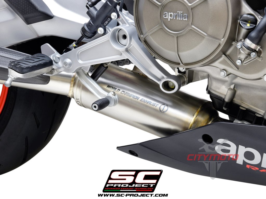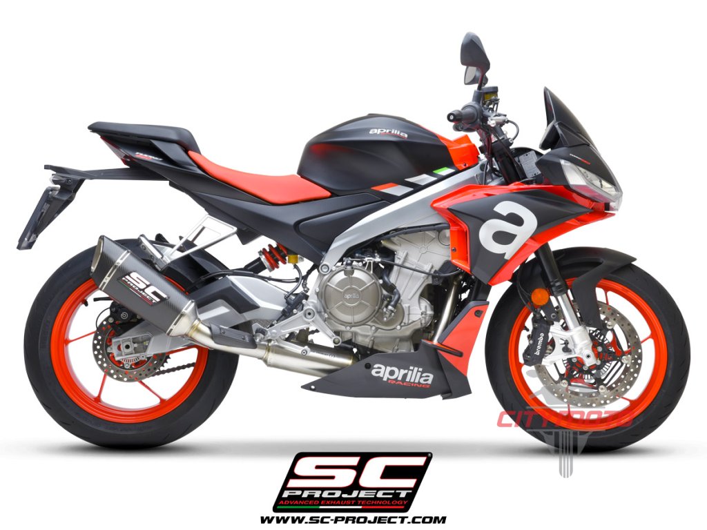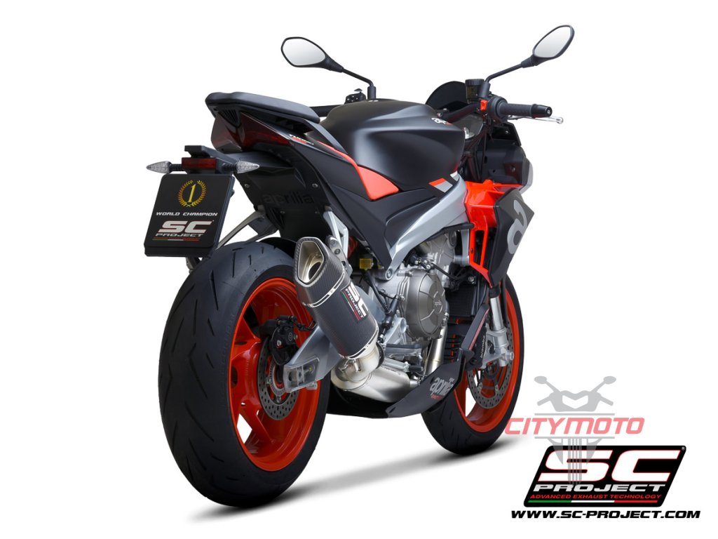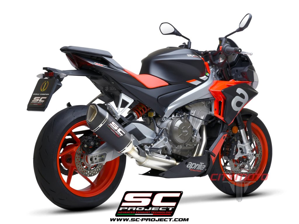 Abyste se nevzdali výkonu a nezaměnitelného zvuku kompletního systému „Trofeo“ s tlumičem SC1-R, oddělení výzkumu a vývoje SC-Project vyvinulo pro vaši Aprilii Tuono 660 systém schválený EURO 5. Celý systém je vybaven předkomorou s pevným designem, v souladu s jedinečným stylem této Aprilie. Díky katalyzátoru vloženému do předkomory je možné získat nejlepší výkon vždy v souladu s evropskými předpisy pro pouliční použití. Produkt je k dispozici s tlumičem SC1-R z titanu nebo uhlíkových vláken a byl vyroben se stejnou přesností a technickými vlastnostmi jako závodní systém: T.I.G. svařování prováděné v kontrolovaném prostředí a pouzdra CNC obráběná z masivu, které zaručují dokonalé spoje. Vyrobeno výhradně z nerezové oceli AISI 304, bylo navrženo pro použití originálních lambda sond. Sada je obohacena o speciální ochranu z uhlíkových vláken a jednosedadlový držák z černého eloxovaného hliníku.