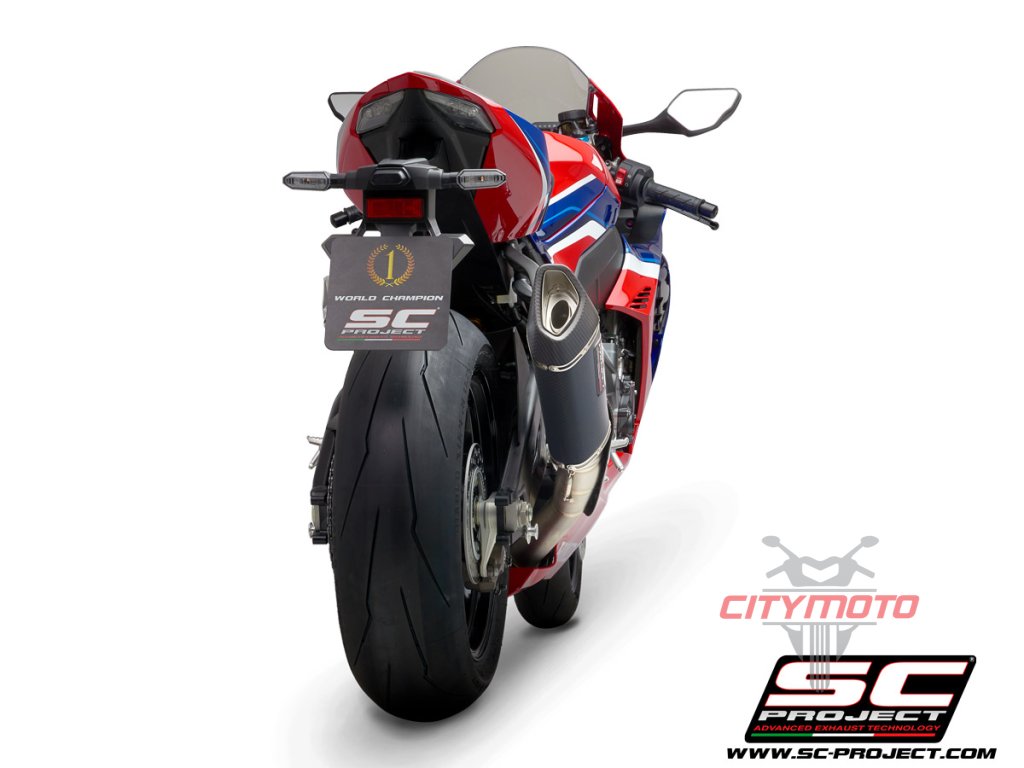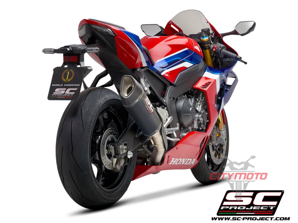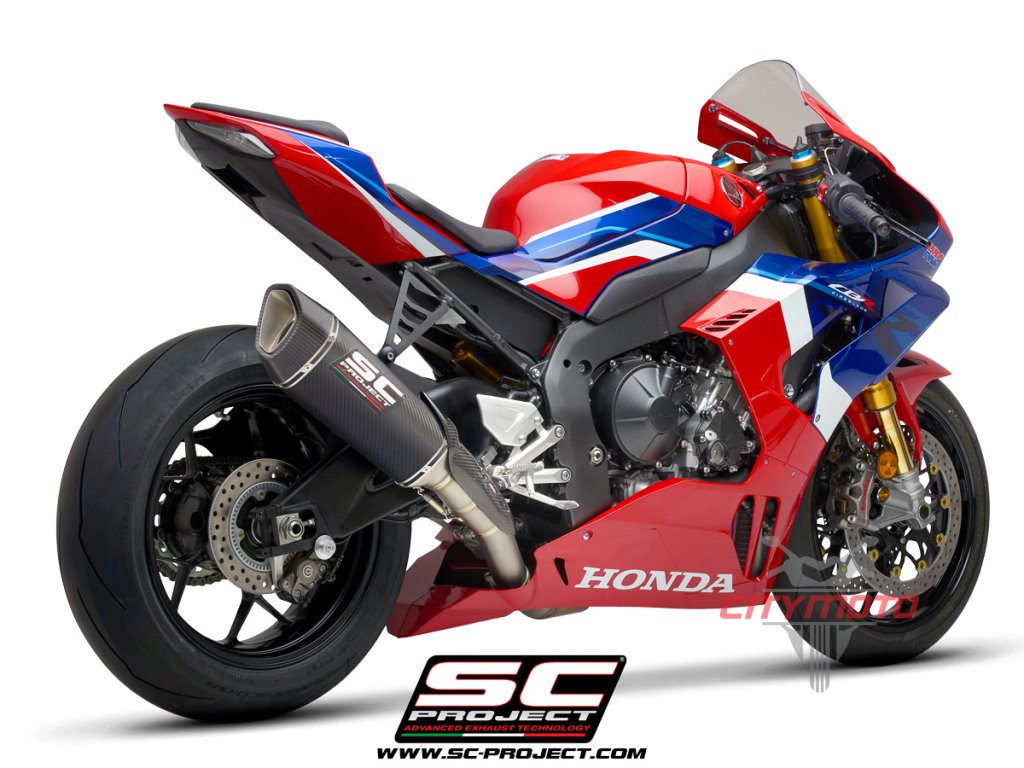 Závodní postoj Hondy CBR1000RR-R se dokonale hodí k tlumiči SC1-R, špičkovému produktu SC-Project z hlediska výkonu a technických řešení. Tlumič SC1-R je maximálním vyjádřením výkonu, kvality a hi-tech řešení pro hypersportovní motocykly. Tato koncovka s velmi agresivním a sportovním vzhledem umožňuje odstranění výfukové klapky díky dodávané titanové závodní spojovací trubce. Toto řešení umožňuje konzistentní snížení hmotnosti ve srovnání s původním výfukem a umožňuje akceptovat hladinu hluku pro použití na závodní dráze: 101 dB @ 5500 ot./min s nainstalovaným dB-killerem a 105 dB @ 5500 ot./min. bez dB-killeru. Pro závodní použití je dB-killer odnímatelný. Trubka je vyrobena procesem hydroformingu a koncovka z uhlíkových vláken s kosočtvercovým a asymetrickým tvarem svařovaná SC1-R nejlepší nasouvací koncovka pro tento motocykl. Pro tuto aplikaci je lehké vnější tělo k dispozici ve dvou variantách: titan nebo uhlíková vlákna. Svařence svařené technologií TIG v chráněném prostředí, zvuk pohlcující materiál odolný vůči velmi vysokým teplotám a pouzdra vložek vyrobená CNC obráběním, zdobí tlumič SC1-R. Sada obsahuje specifickou tepelnou ochranu z uhlíkových vláken. Konečným výstupem tohoto výfuku není jen zvuk, ale je to skutečná hluboká a senzační závodní hudba pro majitele Hondy CBR1000RR-R.