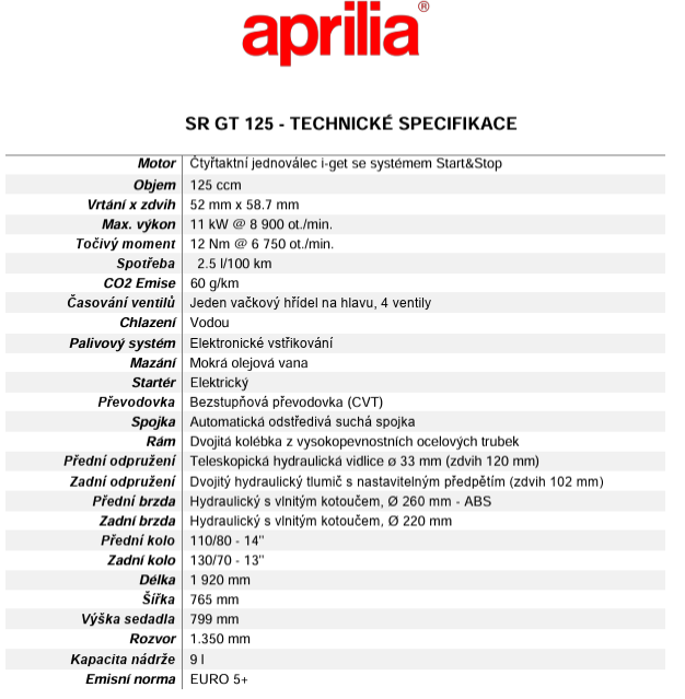 Aprilia SR GT je navržena tak, aby probudila touhu po dobrodružství, která přesahuje hranice města. Je připravena přinést zábavu do jakéhokoli terénu a maximálně využít sílu motoru i-get. Živá 125 s výkonem 11 kW i silná 200 s výkonem 13 kW jsou vybaveny systémem RISS (Regulated Inverter Start & Stop System). Výkon a hbitost ti umožní zdolat jakoukoli výzvu a zažít vášeň při každém nasednutí.