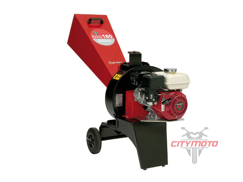 BIO 180: základní model motorových štěpkovačů BIO, poháněný silným a spolehlivým profesionálním motorem, vlastním manipulačním podvozkem a jednonožovým diskovým drtičem dřevěného odpadu.