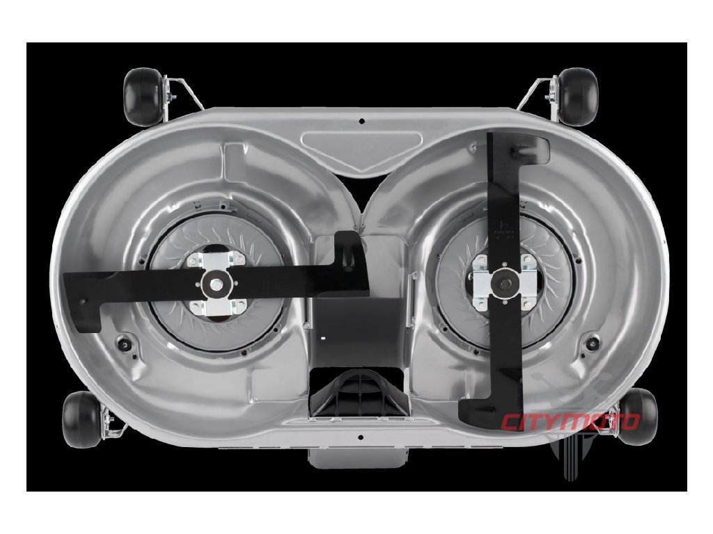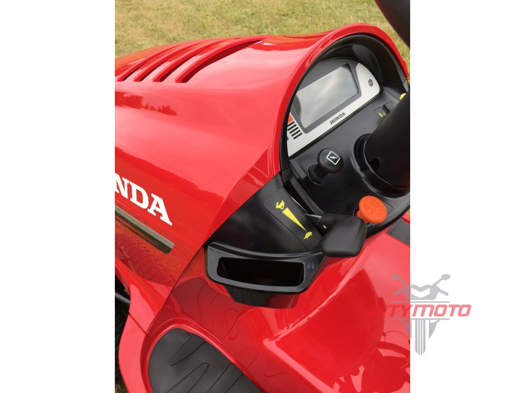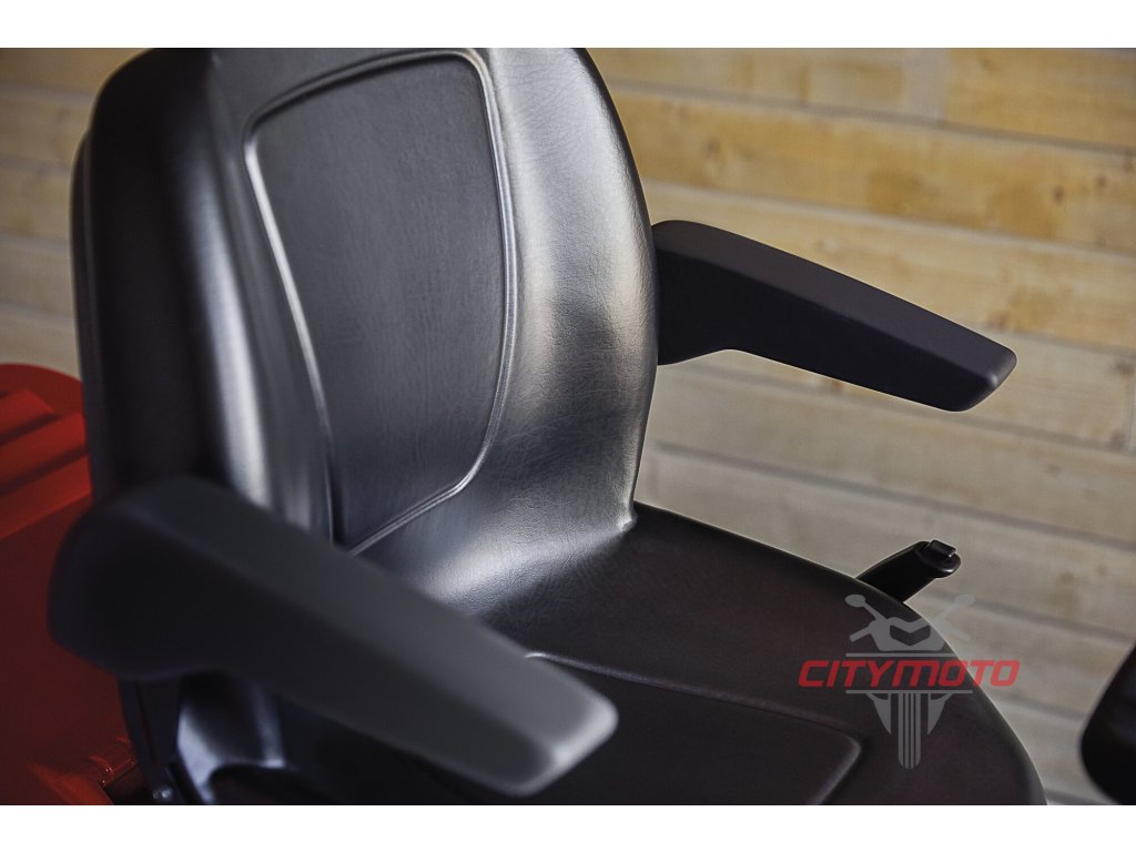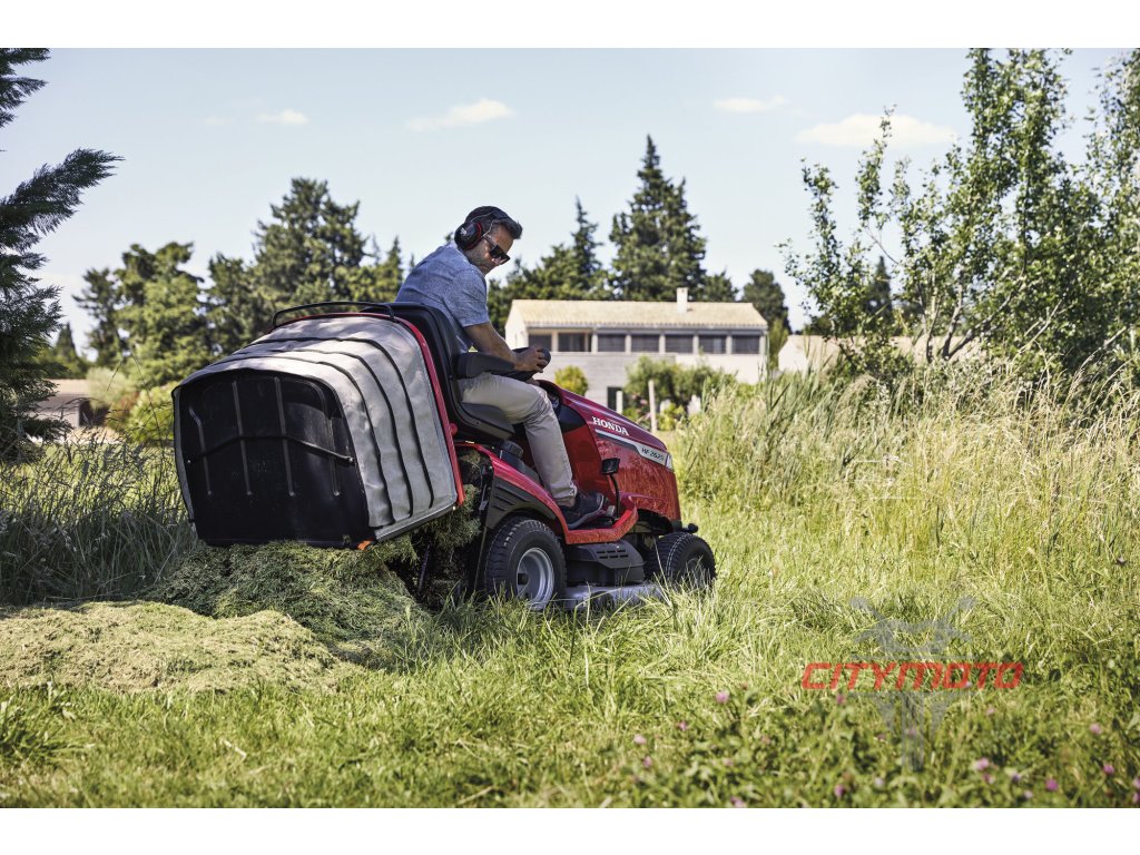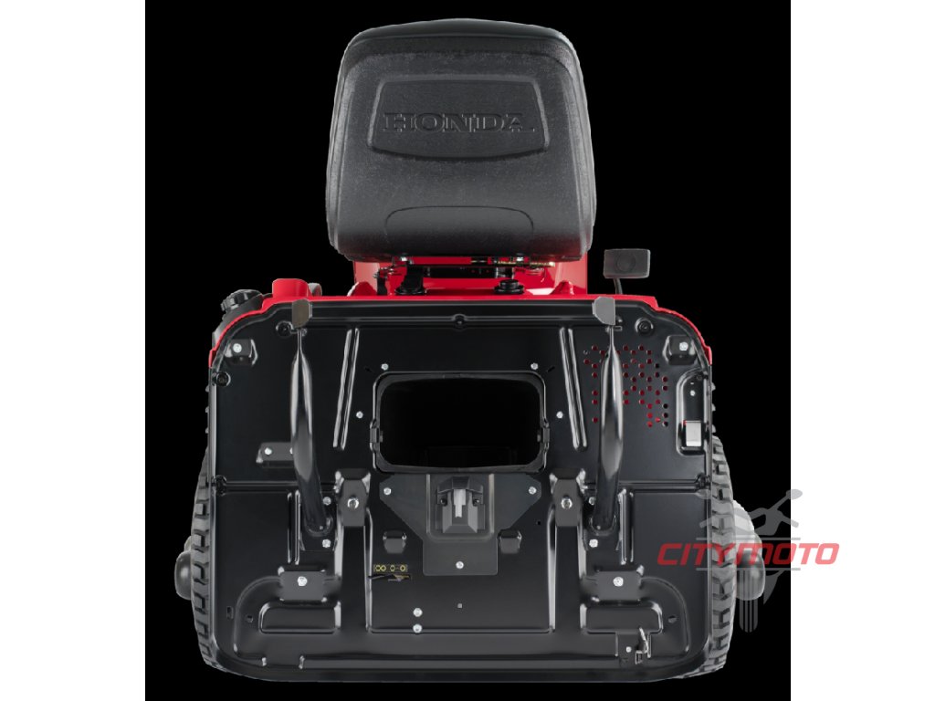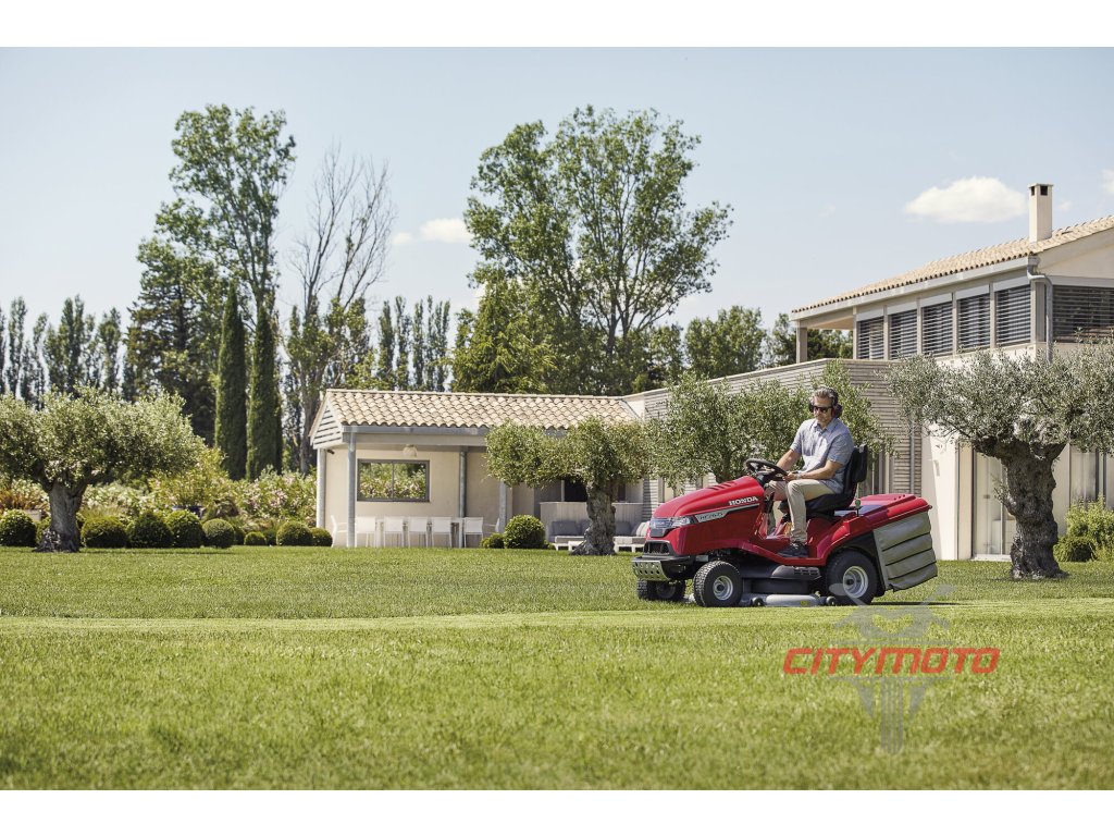 Se sečením o záběru 102 cm si poradí s likvidací travního porostu i na ploše o velikosti několika tisíc metrů čtverečních a přitom svou velikostí je velmi obratný a lze s ním manévrovat i na poměrně členitých zahradách či plochách. Tomu přispívá i způsob ovládání rychlosti jízdy, kdy dle míry stlačení pojezdového pedálu plynule regulujete rychlost od nuly do cca 8,2 km/hod. Nicméně ani na velmi rozlehlých trávnících, jako je třeba fotbalové hřiště, nebudete unaveni. Traktor je opatřen 4 stupňovým tempomatem, který automaticky udržuje nastavenou rychlost jízdy. Praktická schránka se zásuvkou USB pro dobíjení umožňuje obsluze mít mobilní telefon neustále po ruce. Přehledný barevný LCD displej na přístrojové desce neustále hlídá všechny důležité pracovní parametry. Hřebenové řízení je přesné a poloměr zatáčení vám umožní perfektně „obkroužit“ i keře, stromy, záhony nebo jiné překážky. Ergonomická geometrie umístění komfortní sedačky s vysokou zádovou opěrkou a loketními opěrkami, komfortně potaženého volantu příjemného průměru věnce a ovládacích prvků vám umožní i dlouhodobou práci bez pocitu únavy. Srdcem traktoru je pohonná jednotka Honda GCV530, vidlicový ležatý dvouválec s rozvodem OHC, zdvihového objemu 530 ccm a výkonové kategorie 17 koní. U strojů, jakým je zahradní traktor je velmi důležitá schopnost udržet si konstantní kroutící moment, který je zde bezkonkurenčních více než 34 N.m.
