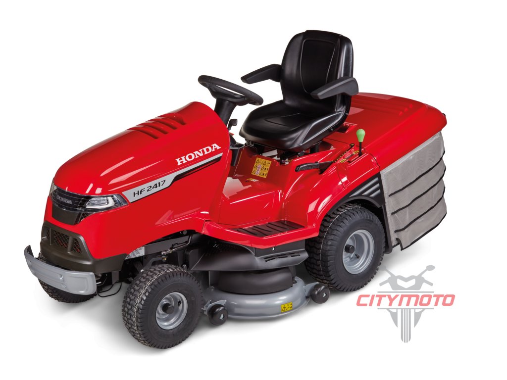 Honda HF 2417 HM: nejoblíbenější model v nabídce zahradních traktorů s plynule proměnným hydrostatickým pojezdem, tempomatem, otevřenou žací komorou s podpůrnými dmychadly, silným dvouválcovým motorem a VersamowTM - integrovaným mulčovacím systémem.