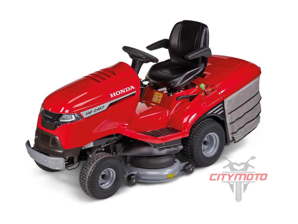 Honda HF 2417 HT: luxusní provedení nabídky zahradních traktorů třídy "Premium" s elektrickým vyklápěním sběrného koše, plynule proměnným hydrostatickým pojezdem a VersamowTM - integrovaným mulčovacím systémem.